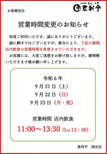 誠に勝手ではございますが令和6年9月21日(土)~9月23日(月・祝)の期間、店内飲食の営業時間を営業時間を11:00~13:30(Lo.13:00)に変更させていただきます。